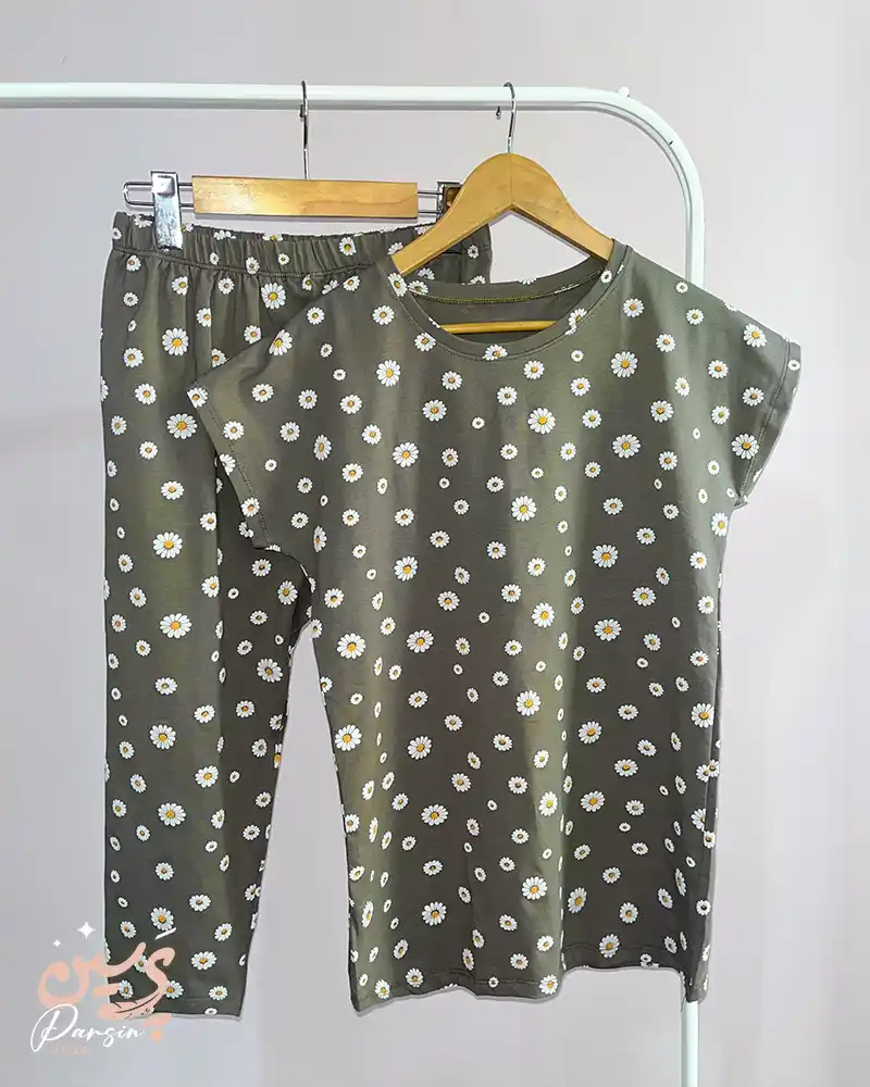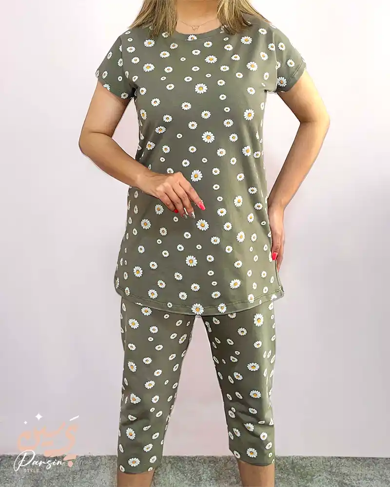 شلوارک: شلوارک این ست مدل برمودا است که تا پایین زانو میرسد. این مدل شلوارک، آزادی حرکت را به شما میدهد و برای استراحت در خانه و یا انجام کارهای روزمره بسیار مناسب است.