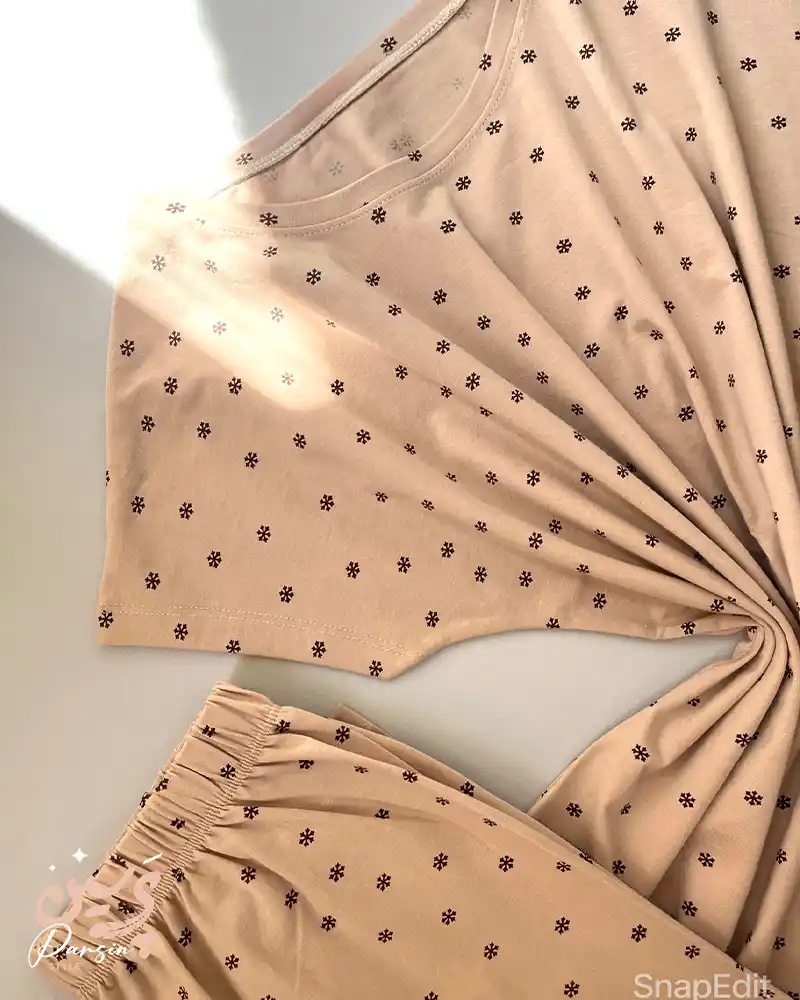 تیشرت: تیشرت این ست یقه گرد ساده دارد و با یک طرح زیبا و تمام چاپ شده است. این طرح جذاب، استایل شما را در خانه زیباتر و شادابتر نشان میدهد.